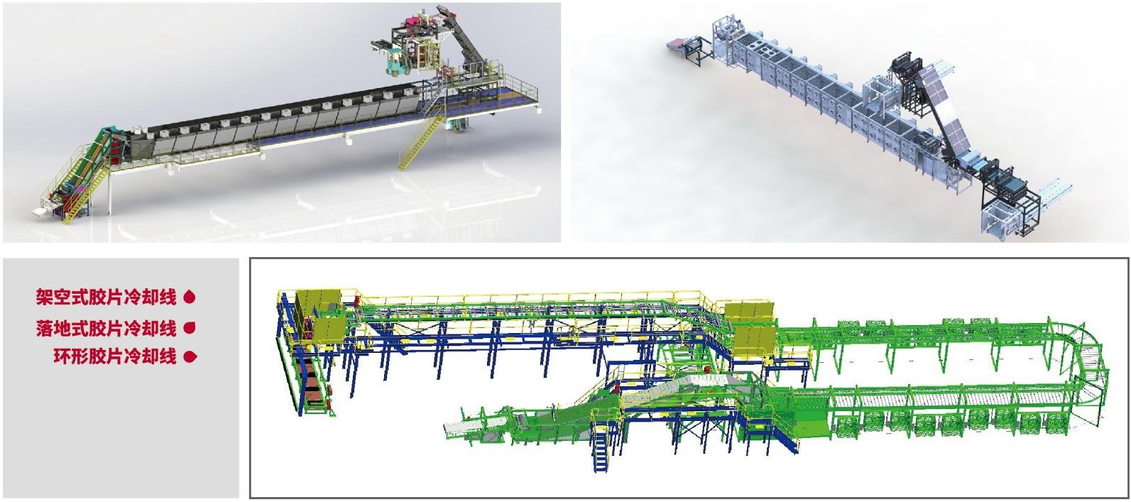 膠片冷卻線是密煉機的配套設備,在膠片冷卻疊片時,與開煉機或雙螺桿擠出機組成現代化煉膠下輔機系統,對膠片實現接取、打標、縱裁、浸涂隔離劑、風干、疊片、稱重等,可廣泛應用于輪胎、制品行業。