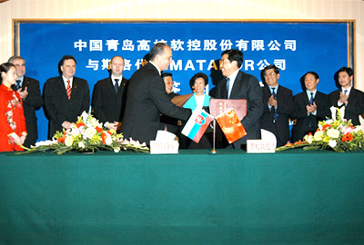 2004年5月11日,我公司與斯洛伐克瑪達(dá)道爾(MATADOR)公司在青島海天大酒店舉行“輪胎設(shè)備技術(shù)合作簽約儀式”。斯洛伐克副總理帕沃爾 羅斯克(Pavol Rusko)先生、青島市人大常委會副主任馬論業(yè)、青島市委副書記、常務(wù)副市長崔錫柱、中國橡膠工業(yè)協(xié)會理事長鞠洪振等有關(guān)領(lǐng)導(dǎo)出席了簽約儀式。