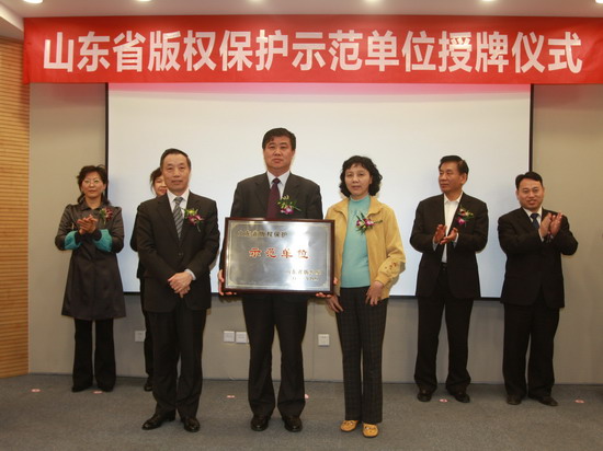 4月22日,山東省版權保護示范單位授牌儀式在公司研發中心隆重舉行。山東省版權局副局長郭愛玲,青島市政府市長助理武鐵軍,市文化市場行政執法局黨組書記、局長徐增敏,以及公司有關領導參加了儀式。