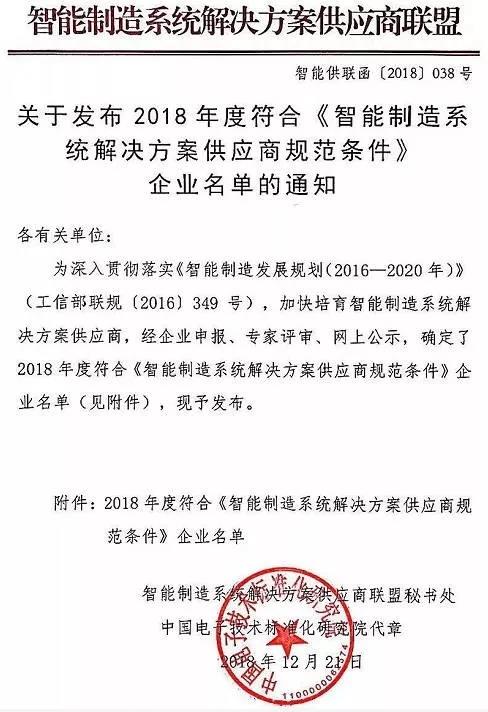為加強智能制造系統(tǒng)解決方案供應(yīng)商管理,深入貫徹落實《智能制造發(fā)展規(guī)劃(2016—2020年)》(工信部聯(lián)規(guī)〔2016〕349號),中國智能制造系統(tǒng)解決方案供應(yīng)商聯(lián)盟組織開展符合《智能制造系統(tǒng)解決方案供應(yīng)商規(guī)范條件》的企業(yè)申報工作,經(jīng)專業(yè)評審、網(wǎng)上公示,最終全國范圍共評選出82家知名企業(yè),山東省共8家企業(yè)入選。